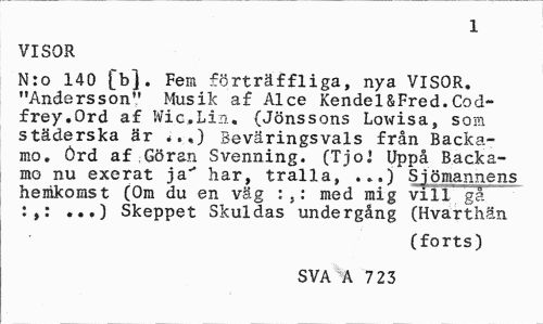 //// 1 //// VISOR //// N:o 140 [b]. Fem förträffliga, nya VISOR. "Andersson" Musik af Alce Kendel&Fred.Cod-frey.Ord af Wic.Lin, (Jönssons Lowisa, som städerska är *.,) Beväringsvals från Backamo. Ord af Göran Svenning. (TjoJ Uppå Backamo nu exerat ja** har, tralla, ...) Sjömannens hemkomst (Om du en väg med mig vill ga ...) Skeppet Skuldas undergång (Hvarthän //// (forts) //// SVA A 7 23 ////