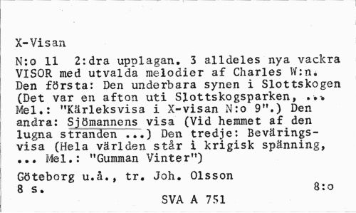 //// X-Visan //// N:o 11 2:dra upplagan. 3 alldeles nya vackra VISOR med utvalda melodier af Charles W:n. Den första: Den underbara synen i Slottskogen (Det var en afton uti Slottskogsparken, ... Mel.: "Kärleksvisa i X-visan N:o 9".) Den andra: Sjömannens visa (Vid hemmet af den lugna stranden ...) Den tredje: Bevärings-visa (Hela världen står i krigisk spänning, ... Mel.: "Gumman Vinter") //// Göteborg u.å., tr. Joh. Olsson 8 s. 8:o //// SVA A 751 ////