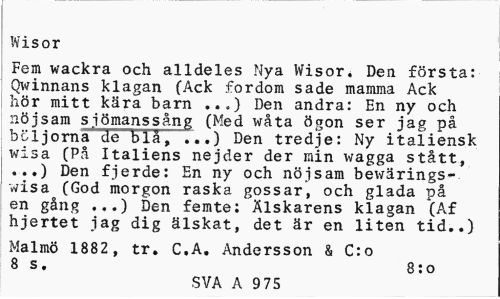 //// Wisor //// Fem wackra och alldeles Nya Wisor, Den första: Qwinnans klagan (Ack fordom sade mamma Ack hör mitt kära barn ..„) Den andra: En ny och nöjsam sjömanssång (Med wåta ögon ser jag på böljorna de blå, ...) Den tredje: Ny italiensk wisa (På Italiens nejder der min wagga stått, ...) Den fjerde: En ny och nöjsam bewärings-wisa (God morgon raska gossar, och glada på en gång .,.) Den femte: Älskarens klagan (Af hjertet jag dig älskat, det är en liten tid,.) //// Malmö 1882, tr. C.A, Andersson & C:o 8 s. 8:0 //// SVA A 9 75 ////