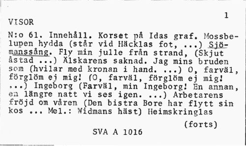 //// 1 //// VISOR //// N:o 61. Innehåll. Korset på Idas graf. Mossbelupen hydda (står vid Häcklas fot, ...) Sjömanssång. Fly min julle från strand, (Skjut åstad ...) Älskarens saknad. Jag mins bruden som (hvilar med kronan i hand. ...) 0, farväl, förglöm ej mig! (0, farväl, förglöm ej mig! ,..) Ingeborg (Farväl, min Ingeborg! Sn annan, en längre natt vi ses igen. ...) Arbetarens fröjd om våren (Den bistra Bore har flytt sin kos Mel.: Widmans häst) Heimskringlas //// (forts) //// SVA A 1016 ////