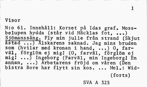 //// 1 //// Visor //// N:o 61. Innehåll: Korset på Idas graf. Mossbelupen hydda (står vid Häcklas fot, ...) Sjömanssång. Fly min julle från strand (Skjut åstad T..) Älskarens saknad. Jag mins bruden som (hvilar med kronan i hand, ...) 0, farväl, förglöm ej mig.' (0, farväl, förglöm ej mig] ...) Ingeborg (Farväl, min Ingeborg! En annan, .;.) Arbetarens fröjd om våren (Den bistra Bore har flytt sin kos. ... Mel.: Wid- //// (forts) //// SVA A 30 325 ////