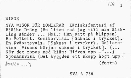 //// TJQ? ! //// WISOR //// NYA WISOR FÖR KOMIKRAR Kärleks fantasi af Bjälbo Dräng (En liten rad jag till min älskling sänder . Mel»: Han satt på klippan) En Polkett. Komikervisa. [Saknas i trycket]. En Kväsarevals. l^Saknas i' trycket~|, Rallarevisa i Visans början saknas i trycket]. (... När det ropas med kläm: Hifven opp —"...) , Sjömansvisa (Det byggdes ett skepp högt upp u //// Xlorden (forts) //// SVA A 736 ////