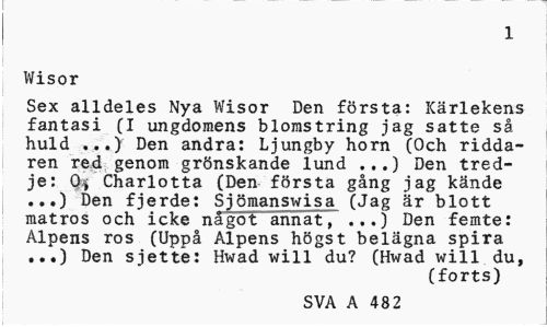 //// 569 //// Wisor //// Sex alldeles Nya Wisor Den första: Kärlekens fantasi (I ungdomens blomstring jag satte så huld ...) Den andra: Ljungby horn (Och riddaren red genom grönskande lund ...) Den tredje: Charlotta (Den första gång jag kände ...) Den fjerde: Sjömanswisa (Jag är blott matros och icke något annat, ...) Den femte: Alpens ros (Uppå Alpens högst belägna spira ...) Den sjette: Hwad will du? (Hwad will du, //// (forts) //// SVA A 569 75 ////