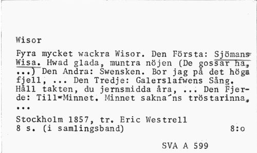 //// Wisor //// Fyra mycket wackra Wisor. Den Första: Sjöman? Wisa. Hwad glada, muntra nöjen (De gossärliäj .) Den Andra: Swensken. Bor jag på det högs fjell, ... Den Tredje: Galerslafwens Sång. Håll takten, du jernsmidda åra, ... Den Fjer-de: Till®Minnet. Minnet sakna^ns tröstarinna^ ... //// Stockholm 1857, tr. Eric Westrell 8 s. (i samlingsband) 8:0 //// SVA A 599 ////