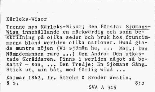 //// Kärleks-Wisor //// Trenne nya Kärleks-Wisor; Den Första: Sjömans-Wisa innehållande en märkwärdig och sann be-skrifning på olika seder och bruk hos fruntim-merna bland werlden olika nationer. Hwad glada muntra nöjen (Wi sjömän ha, . „ . Mel,: Den Nämndemannen rare ..,) Den Andra: Den utkastade Skräddaren. Finns i werlden något så besatt? — san, ... Den Tredje: En Sjömans Sång. Stick ut, min båt, med förlig wind ... //// Kalmar 1853, tr. Ströhm & Bröder Westin. 8 s„ 8:0 //// SVA A 34 5 ////
