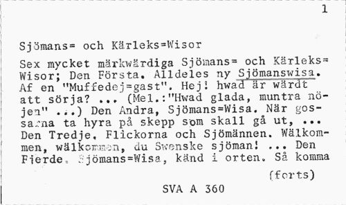 //// 1 //// Sjömans» och Kä.rleks=Wisor //// Sex mycket märkwärdiga Sjömans= och Kärleks» Wisor; Den Första. Alldeles ny Sjömanswisa. Af en "Muffedej=gast". Hej! hwad är wärat att sörja? ... (Mel.:"Hwad glada, muntra nöjen" ...) Den Andra, Sjömans=Wisa. När gossarna ta hyra på skepp som skall gå ut, ... Den Tredje, Flickorna och Sjömännen. Wälkom-men, wälkorman, du Swenske sjöman? ... Den Fierde, Sjömans»Wisa, känd i orten. Så komma //// (forts) //// SVA A 360 ////