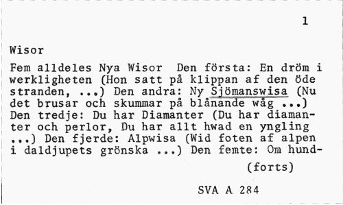 //// 1 //// Wisor //// Fem alldeles Nya Wisor Den första: En dröm i werkligheten (Hon satt på klippan af den Öde stranden, ...) Den andra: Ny Sjömanswisa (Nu det brusar och skummar på blånande wåg ..,) Den tredje: Du har Diamanter (Du har diamanter och perlor, Du har allt hwad en yngling ...) Den fjerde: Alpwisa (Wid foten af alpen i daldjupets grönska ...) Den femte: Om hund- //// (forts) SVA A 284 ////