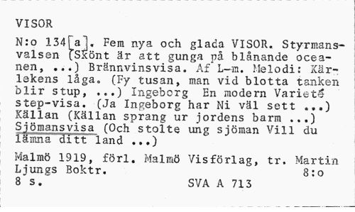 //// VISOR //// N:o 134[al. Fem nya och glada VISOR. Styrmans-valsen (Sxönt är att gunga på blånande oceanen, ...) Brännvinsvisa. Af L-m. Melodi: Kärlekens låga. (Fy tusan, man vid blotta tanken blir stup, ...) Ingeborg En modern Varieté step-visa. (Ja Ingeborg har Ni väl sett „..) Källan (Källan sprang ur jordens barm ...) Sjömansvisa (Och stolte ung sjöman Vill du lämna ditt land ...) //// Malmö 1919, förl. Malmö Visförlag, tr. Martin Ljungs Boktr. 8:0 //// 8 s. SVA A 713 ////