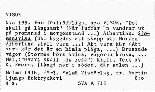 //// VISOR //// N:o 135. Fem förträffliga, nya VISOR. "Det skall gå långsamt" (När luffar " n vandrar ut på promenad i morgonstund ...) Albertina. Sjömans vis a (Där byggdes ett skepp uti Norden Albertina skall vara ...) Att vara kär (Att vara kär det är en himla plåga, ...) Brusande vågor (Stormen hörs hvina, vågorna brusa, ... Mel.:"Hvart skall jag resa") Kicki, Text av K. Ewert. (Långt ner'i söder, där solen .) //// Malmö 1916, förl. Malmö Visförlag, tr. Martin Ljungs Boktryckeri 8:0 //// 8 s. SVA A 715 ////
