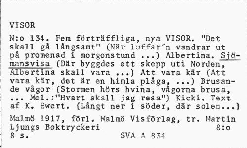 //// VISOR //// N:o 134. Fem förträffliga, nya VISOR. "Det skall gå långsamt" (När luffaren vandrar ut på promenad i morgonstund ...) Albertina. Sjömansvisa (Där byggdes ett skepp uti Norden, Albertina skall vara ...) Att vara kär (Att vara kär, det är en himla plåga, ...) Brusande vågor (Stormen hörs hvina, vågorna brusa, ... Mel.:"Hvart skall jag resa") Kicki. Text af K. Ewert. (Långt ner i söder, där solen...) //// Malmö 1917, förl. Malmö Vis förlag, tr. Martin Ljungs Boktryckeri 8:0 //// 8 s. SVA A 8 34 ////