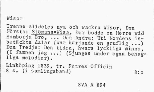 //// Wisor //// Trenne alldeles nya och wackra Wisor, Den Första: Sjömana=Wisa. Der bodde en Herre wid Hamborja Bro,',.'. Den Andra: Uti Nordens is-betäckta dalar (War häriande en gruflig ...) Den Tredje: Den tiden, hwars lyckliga minne, (I famnen jag ...) (Sjunges under egna behagliga melodier). //// Linköping 1839, tr. Petres Officin 8 s. (i samlingsband) 8:0 //// SVA A 894 ////