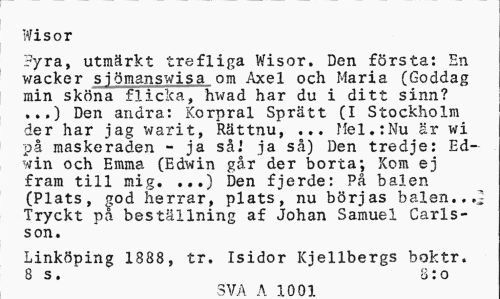 //// Wisor //// Pyra, utmärkt trefliga Wisor. Den första: En wacker siömanswisa om Axel och Maria (Goddag min sköna flicka, hwad har du i ditt sinn? ..,) Den andra: Korpral Sprätt (I Stockholm der har jag warit, Rättnu, ... Mel.:Nu är wi på maskeraden - ja så! ja så) Den tredje: Edwin och Emma (Edwin går der borta; Kom ej fram till mig. ...) Den fjerde: På balen (Plats, god herrar, plats, nu börjas balen...j Tryckt pa beställning af Johan Samuel Carlsson. //// Linköping 1888, tr, Isidor Kjellbergs boktr. 8 s. ~ 8:0 //// SVA A 10 01 ////