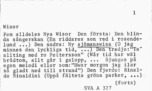 //// 1 //// Wisor //// Fem alldeles Nya Wisor Den första: Den blinda sångerskan (En riddares son red i rosende-lund ...) Den andra: Ny sjömanswisa (0 jag minnes den lyckliga tid, .T7J™lTen tredje:"Ta" allting med ro Pettersson" (Wår tid har wäl brådtom, allt går i galopp, ... Sjunges på egen melodi eller som:"Hwar morgon jag ilar så gladt ned till strand") Den fjerde: Rinal-do Rinaldini (Uppå fältets gröna parker, ..,) //// (forts) //// SVA A \71 ////