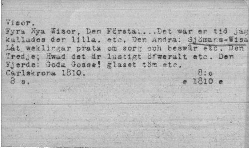 //// Vi eer. //// Fyr» %a £iaorf "Den Första;.. . .Det 's&r er tid jap //// kallades der lilla, etc, !Den Andra: SJöaans-Wisä //// Låt. weklindar prata cm sor^ och fcesw'ir et"b .""TTen" //// Tredje; Hnad det är lustigt öfweralt etc. Den //// Fjerde; loda Ooase! glaset töm stc. Carlskrona iSlO. 8;o 8 s. e 1810 e ////