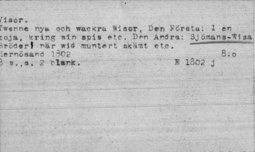 //// risor. //// 'wsnne nya och wacicra Wisor, Den Första: i en :oja, Kring sin spis etc, D^n Andra; Sjöman Isa //// ircdsr! när wid muntert sKä-nt etc. —¦ 111... //// iernösand iSCS 8:0 //// i 3 . , s. 2 bl»nk. 75 lS02 j ////