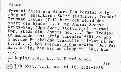 //// Wisor //// Fyra alldeles nya Wisor. Den Första: Krigssång af Fanjunkaren Swärd (Kamrater, framåt.' Trumman ljuder (Till kamp och strid den snart oss bjuder ...) Den Andra: Swensk Krigs=Sång (Upp Swea, stolta Hjelte=amma! Upp, skåda dina Söners mod ...) Den Tredje: En manande röst (Från tusenåra fjällen upp i norden En sköldmö tankfullt blickar på en strid ...) Den Fjerde: Si ömansaWisa (Och Far min, salig, han war en s"keppare, han, han //// Linköping 1848, tr. A. Petré & Son 8 s. 8:0 //// 9QIKB okat. Vitt. sv. milit. 1835-1938 ////