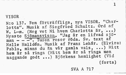 //// 1 //// VISOR //// N:o 137. Fem förträffliga, nya VISOR. "Charlotta". Musik af Siegfried Schultz. Ord af W. L-m. (Nog vet Ni hvem Charlotta är, ...) Nyaste Sjömans visan,. "Jag är en lifvad sjöman ---".Tusen rosor röda. Sv. text af //// Nalle Halidén. Musik af Franz Lehår. (Elvira: Pablo, minns du än vår gamla vals, ...) Mitt hem är så ringa (Mitt hem är så ringa men naggande godt ...) Björkens hemlighet (Vid //// (forts) //// SVA A 717 ////