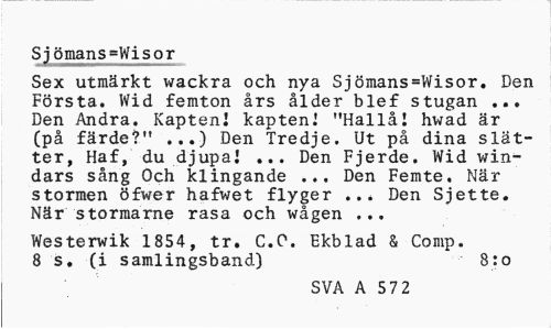 //// Sjömans=Wisor //// Sex utmärkt wackra och nya Sjömans=Wisor. Den Första. Wid femton års ålder blef stugan ... Den Andra. Kaptenl kapten! "Hallå! hwad är (på färde?" ...) Den Tredje. Ut på dina slätter, Haf, du djupaj ... Den Fjerde. Wid win-dars sång Och klingande ... Den Femte. När stormen öfwer hafwet flyger ... Den Sjette. När stormarne rasa och wågen ... //// Westerwik 1854, tr. C.O. Ekblad & Comp. 8 s. (i samlingsband) 8:0 //// SVA A 572 ////