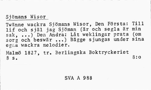 //// Sjömans Wisor //// Twänne wackra Sjömans Wisor, Den Första: Till lif och själ jag Sjöman (är och segla är min sak, Den Andra; Låt weklingar prata (om //// sorg och beswär ...) Bägge sjungas under sina egna \vackra melodier. //// Malmö 182 7, tr. Berlingska Boktryckeriet 8 s. 8:0 //// SVA A 988 ////