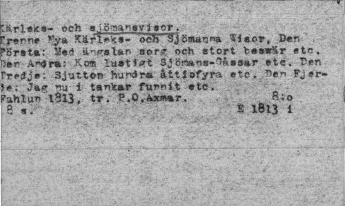 //// friska- och »j^amy i »or //// Frenne »Va Kärleka- ocE~~$jömanna Siaor, Den Företa: ängslan sorg och atort fceswlir etc Der A^ra; Kom luat^t SJ örtan s- a aa r etc. Ten Tretfje; Sjutton hundra åttiofyra etc. Ben Fjsr. 3e; Jag nu i tankar funnit etc. Fahlur 1813, tr. P.O.Axmar. //// * S 1613 i //// * ////