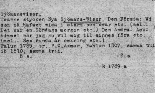 //// Sj ömansvi sor, //// Twänne stycken Nya Sjöm^ns-Wisor, Den Första; Wi asm på ha fur et wida i a 14WT" o^^wä r etc. (mel.: Det war en Söndags morgon etc.) Den Andra: Ackl himmel när jag nu wil mig til sinnes föra etc. (mel.. Sex runda år omkring etc.) Falun 1789, tr. P.C.Axraar, Fahlun 1807, samma teJ ih 1810, samma tr;i. //// 8 a. t:o //// R 1789 » ////