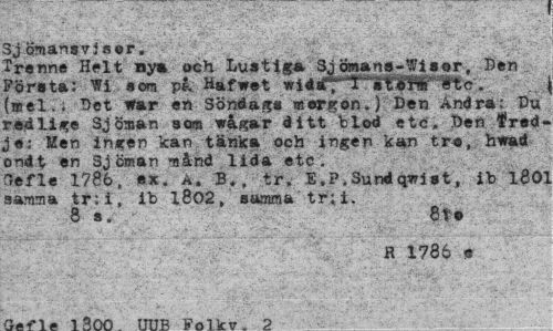 //// 3j ömansvJ ser. //// Trenne Helt ny» och Lustiga Sj ömans-Wiser, Den ., Första: Wi som på Hafwet widrf^iT^stiniW' etc. (»el.; Det War en Söndags morgon.) Den Ändra: Du resålige Sjöman som wå.gar ditt blod etc. Den tfred-je.: Men ingen kan tänka och ingen kan tr®, hwad ondt en Sjöman månd lida etc, //// Gefle 1786, ex. a. B., tr. E.P.Sundqwist, ib 1801 samma tr:i, ib 1802, samma tr;i. //// 8 s. 8t• //// H 1786 * //// n.»-1 - i ttiitj »^ivw O ////