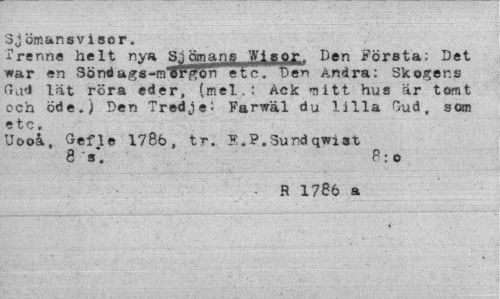 //// 3j ömans visor. //// ¦Trenne helt nya S.1 ömans Wisor. Den Första: Det war en Sondags-m"¥ret"c. uen Andra: Skogens Gud lät röra eder, (mel.; Ack nitt hus är tomt och öde.) Den Tredje^ Farwäl du lilla Gud, som etc» //// Uooå., Gefle 1786, tr. F,. ?. Sund qwi 3t //// 8 V. P: o //// R 1786 a ////