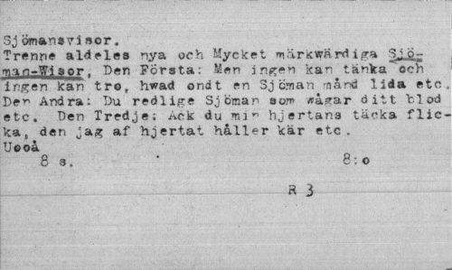 //// 3j Öman» v i »or. //// Trenne aldeles nya och Mycket märkvärdiga Sjja-man-Wi sor. Den Första: Men ingen kan tänka och ingen kan tro, hwad ondt «n Sjc.man -nånd lida etc De^ Andra: Du redlige Sjöman som *ågar ditt flod etc. Den Tredje; Ack du mi" hjertana täcka flicka, den jag af hjertat håller kär etc. Ueoå //// 8s. ' 8:0 //// H 3 ////