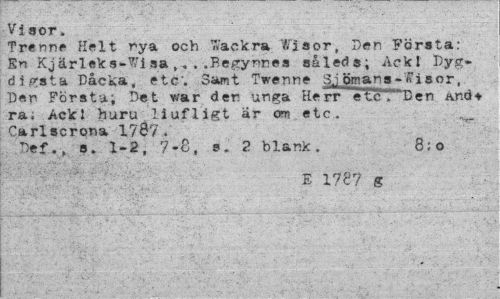 //// Visor, //// Trenne Halt rya ocb 7<'ackra Wisor, Den Första: En Kjärleks-Wi aa ,. . .Begynnea såleds; Ackl Pyg-di^sta Dåcka, etc". Samt Twenne SJ öman a- "fri a or. Den Första; Det war der unga Herr etcT"Den and* ra. Ack! huru liufligt är om etc. Carl serona 1787 . Pe£v, a. 1-2, 7-8, s. 2 blank. 8; o //// E 1787 g ////