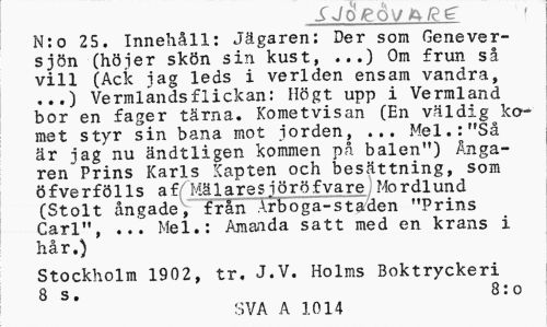 //// ti SJO/e0V4ree //// N:o 25. Innehll: Jgaren: Der som Genever-sjn (hjer skn sin kust, ...) Om frun s vill (Ack jag leds i verlden ensam vandra, ...) Vermlandsflickan: Hgt upp i Vermland bor en fager trna. Kometvisan (En vldig komet styr sin bana mot jorden, ... Mel.:"S //// r jag nu ndtligen kommen p balen") ngaren Prins Karls Kapten och besttning, som fverflls af7Mlaresirfyare Mordlund (Stolt ngade, ffrai i-boga-giaden "Prins Carl", ... Mel.: Amanda satt med en krans i hr.) //// Stockholm 1902, tr. J.V. Holms Boktryckeri //// 8 s. 8:o //// SVA A 1014 ////