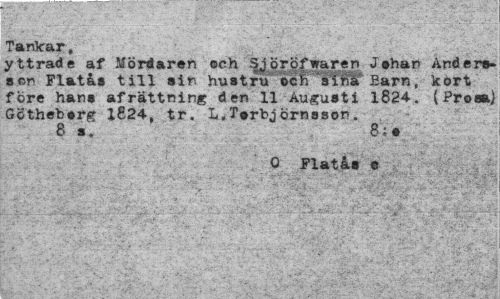 //// Tankar, //// yttrade af Mrdaren och $jrfwanen Johan andra-'i son Fiats til1 sir hustru och eina- Barn, kort fre hane afrttning den 11 Augusti 1824. (Proea) Gtheberg 1824, tr. L.Torbjrnsson. //// 8 s. 8 ; //// 0 Flate c ////