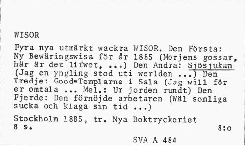 //// WISOR //// Fyra nya utmrkt wackra WISOR. Den Frsta: //// Ny Bewringswisa fr r 1885 (Morjens gossar, hr r der lifwet, ...) Den Andra: Sjsjukan i (Jag en yngling stod uti werlden ...) Den Tredje: Good-Templarne i Sala (Jag will fr //// er omtala ... Mel.: Ur jorden rundt) Den Fjerde: Den frnjde arbetaren (Wl somliga sucka och klaga sin tid ...) //// Stockholm 1885, tr. Nya Boktryckeriet //// 8 s. 8:o //// SHIA. A 484 ////