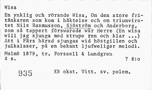 //// Wisa //// En ynklig och rrande Wisa, Om den store fritnkaren som kom i hktelse och om triumviratet Nils Rasmusson, Sjstrm och Anderberg, som s tappert frswarade wr Herre (En wisa will jag sjunga med strupe ren och klar ...) Att i Frs hrad sjungas wid hstgillen och julkalaser, p en bekant ljufweliger melodi. //// t Malm 1879, tr. Forssell & Lundgren //// 4 s. 7 8:o //// 935 KB okat. Vitt. sv. polen'. ////