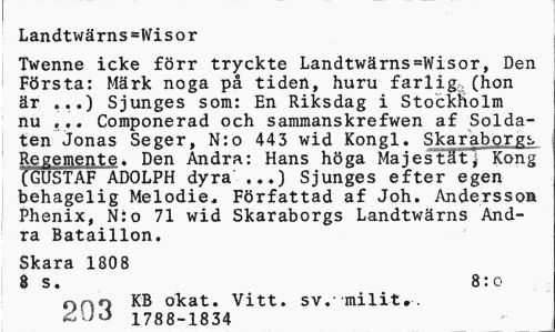//// Landtwrns=Wisor //// Twenne icke frr tryckte Landtwrns.Wisor, Den Frsta: Mrk noga p tiden, huru farlig,(hon r ...) Sjunges som: En Riksdag i StoCkholm //// nu ... Componerad och sammanskrefwen af Soldaten Jonas Seger, N:o 443 wid Kongl. Skar'abor Re e e. Den Andra: Hans hga Majest Kong //// GUSTAF ADOLPH dyra' ...) Sjunges efter egen behagelig Melodie. Frfattad af Joh. Andersson Phenix, N:o 71 wid Skaraborgs Landtwrns Andra Bataillon. //// Skara 1808 //// 8 s. 8:c //// KB okat. Vitt. sv.milit.. //// 200 1788-1834 ////
