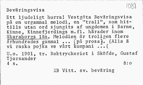 //// 051 //// Bevringsvisa //// Ett ljudeligt hurra! Vestgta Bevringsvisa p en urgammal melodi, en "trall", som hittills utan ord sjungits af ungdomen i Barne, Kinne, Kinnefjerdings m.fl. hrader inom Skaraborgs ln. Melodien r troligen flere rhundrades gammal ... rp prosa). (Alla vi raska pojka ve vrt kompani ...( //// U.o. 1901, tr. Boktryckeriet i Skfde, Gustaf Tjorsander //// 4 s. 8:o //// KB Vitt. sv. bevring ////