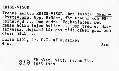 //// KRIGS-VISOR //// Trenne muntra KRIGS-VISOR. Den Frsta: SkarpskyttetgAng. Upp, Brder, fr Konung och Fdernebygd ... Den Andra: Folk=Sngen. Det gamla Gtha lejon hwilar ... Den Tredje: Hussar=Wisa. Hejsan! Lt oss rida fwer graf och fwer hck ... //// Lule 1861, tr. G.C. af Klerckar //// 4 s. 8:o //// Q KB okat. Vitt. sv. milit. 1835-19J8 ////