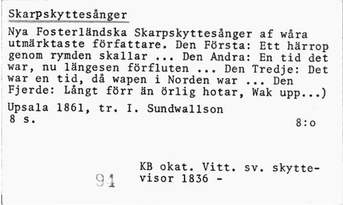 //// Skarpskyttesnger //// --- //// Nya Fosterlndska Skarpskyttesnger af wra utmrktaste frfattare. Den Frsta: Ett hrrop genom rymden skallar ... Den Andra: En tid det war, nu lngesen frfluten ... Den Tredje: Det war en tid, d wapen i Norden war ... Den Fjerde: Lngt frr n rlig hotar, Wak upp...) //// Upsala 1861, tr. I. Sundwallson //// 8 s. 8:o //// KB okat. Vitt. sv. skyttevisor 1836 - ////