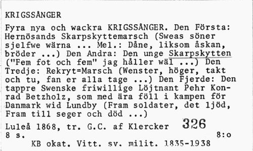 //// KRIGSSANGER //// Fyra nya och wackra KRIGSSANGER. Den Frsta: Hernsands Skarpskyttemarsch (Sweas sner //// isjelfwe wrna Mel.: Dne, liksom skan, //// brder ...) Den Andra: Den unge Skarpskytten ("Fem fot och fem" jag hller wr...) Den Tredje: Rekryt=Marsch (Wenster, hger, takt och tu, fan er alla tage ...) Den Fjerde: Den tappre Swenske friwillige Ljtnant Pehr Konrad Betzholz, som med ra fll i kampen fr Danmark wid Lundby (Fram soldater, det ljd, Fram till seger och dd ...) //// Lule 1868, tr. G.C. af Klercker 396 //// 8 s. 8:o //// KB okat. Vitt, sv. milit. 1R35-1938 ////