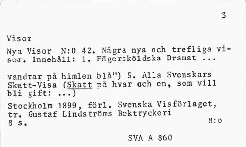 //// 3 //// Visor //// Nya Visor N:0 42. Ngra nya och trefliga visor. Innehll: 1. Fgerskldska Dramat ... //// vandrar p himlen bl") 5. Alla Svenskars Skatt-Visa (Skatt p hvar och en, som vill bli gift: //// Stockholm 1899, frf. Svenska Visfrlaget, tr. Gustaf Lindstrms Boktryckeri //// 8 s. 8:o //// SVA A 860 ////