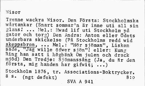 //// Trenne wackra Wisor. Den Frsta: Stockholmska //// 1 wrtankar (Snart sommar'n r inne uti all sin glans: Mel.: Hwad lif uti Stockholm p //// gator och torg) Den Andra: Anton eller dets underbara skickelse (P Stockholms redd wid skeppsbron, ... Mel.: "Hr sjman", Lisken sade, "Jag wllle fwer sjn": eller: Kulm Ring han satt i hgbnk Om julen och drack mjd) Den Tredje: Sjmanssng (Ja, du r den frsta, mig handen har gifwit; ...) //// Stockholm 1876, tr. Associations-Boktrycker. 8 Se (ngt defekt) 8:0 //// SVA A 941 ////