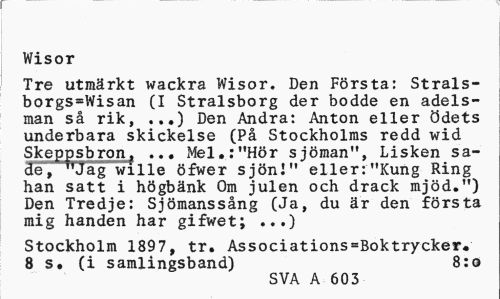 //// Wisor //// Tre utmrkt wackra Wisor. Den Frsta: Stralsborgs=Wisan (I Stralsborg der bodde en adelsman s rik, ...) Den Andra: Anton eller dets underbara skickelse (P Stockholms redd wid //// Skeppsbron Mel.:"Hr sjman", Lisken sa- //// e, 'Jag wille fwer sjns" eller: "Kung Ring han satt i hgbnk Om julen och drack mjd.") Den Tredje: Sjmanssng (Ja, du r den frsta mig handen har gifwet; ...) //// Stockholm 1897, tr. Associations=Boktrycker. 8 s. (i samlingsband) 8:o //// SVA A 603 ////