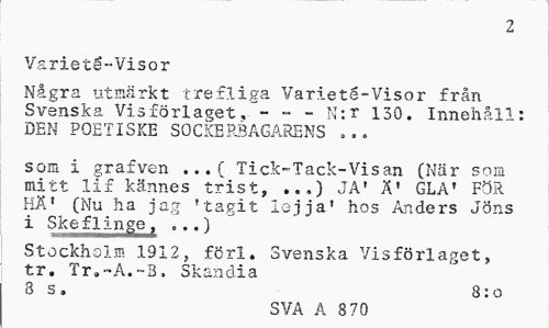 //// 2 //// Varietg-Visor //// Ngra utmrkt trefliga Variet6-Visor frn Svenska Visfrlaget - o - N:r 130. Innehll: DEN POETISKE SOCKEPS3AGARENS //// som i grafven ... ( Tick-Tack-Visan (Nr som mitt lif knnes trist, ...) JA' ' GLA' FIR H' (Nu ha ja T, 'tagit Jjja' hos Anders Jns i Ikeflinzu ...) //// StJckholm 1912, frf. Svenska Visfrlaget, tr. Tr.-A.-B. Skandia //// 8 s. 8:0 //// SVA A 870 ////