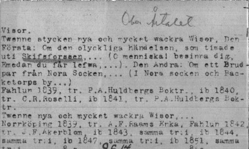//// - -1 //// (4, //// Tisor, //// Twenne stycken nya och n-yekf't wackra Wir, nen Frsta: Gm den olyckliga hnelsen, som timae.e uti Omenriskal besinra dig, BTedar, Gu at- efwa,...), Den Andra, Pm ett Brud //// par frn 1,ora Socken, (1 Nora e.ocken och Packtorps by...) //// Fahlun 1C39, tr, P.A.Huldbergs Boktr,, ib 140, tr. C.R.floselli, ib 1241, tr. P.A.Yluldlergs Eok-' ir. //// Twenne nya och mycket waekra Wisor,... //// Norrkpint7 1839, tr, .4,P.Aaams Enka, Fahlur 1842, Tr,F,Akertlom, ib 1843, samma tri, ib 1844. samma tri, ib le47, summa tr:i, ib 1851, samma ////