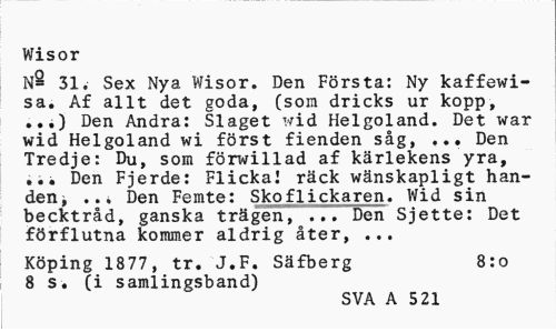 //// Wisor //// N2 31. Sex Nya Wisor. Den Frsta: Ny kaffewisa. Af allt det goda, (som dricks ur kopp, ...) Den Andra: Slaget wid Helgoland. Det war wid Helgoland wi frst fienden sg, ... Den Tredje: Du, som frwillad af krlekens yra, ... Den Fjerde: Flicka! rck wnskapligt handen, Den Femte: Skoflickaren. Wid sin //// becktrd, ganska trgen, ... Den Sjette: Det frflutna kommer aldrig ter, ... //// Kping 1877, tr. J.F. Sfberg 8:o //// 8 s. (i samlingsband) //// SVA A 521 ////