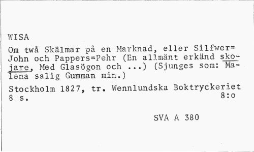 //// WISA //// Om tw Sklmar p en Marknad, eller Silfwer= John och Pappers=Pehr (En allmnt erknd skojare, Med Glasgon och ...) (Sjunges som: Ma-lena salig Gumman min.) //// Stockholm 1827, tr. Wennlundska Boktryckeriet 8 s. 8:o //// SVA A 380 ////