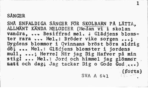 //// SNGER //// SM ENFALDIGA SNGER FR SKOLBARN P LTTA, ALLMNT KNDA MELODIER (Medan vi i skolan vandra, 13esiffrad mei. 4 Gldjens bloms- //// ter rara Mel.: Brder vike sorgen ...; //// Dygdens blommor i Qvinnans brst bra aldrig d; ... Mel.: Gldjens blomster i jordens //// mull, Herre! Nr jag Dig Hafver p min //// stig! ... Mei.. Jord och himmel jag glmmer katt och dag; Jag tackar Dig o Gode Gud //// (forts) //// SVA A 641 ////