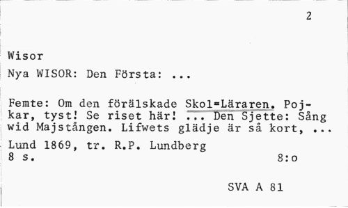 //// 2 //// . Wisor //// Nya WISOR: Den Frsta: ... //// Femte: Om den frlskade Skol=.Lraren. Pojkar, tyst! Se riset hri Den Sjette: Sng //// wid Majstngen. Lifwets gldje r s kort, //// Lund 1869, tr. R.P. Lundberg //// 8 s. 8:o //// SVA A 81 ////