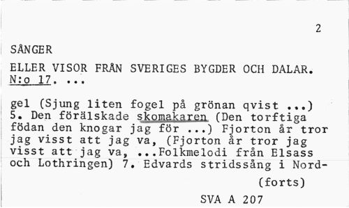 //// 2 //// SNGER //// ELLER VISOR FRN SVERIGES BYGDER OCH DALAR. N:o 17. ... //// gel (Sjung liten fogel p grnan qvist ...) 5. Den frlskade skomakaren (Den torftiga fdan den knogar jag fr ...) Fjorton r tror jag visst att jag va, (Fjorton r tror jag visst att jag va, ...Folkmelodi frn Elsass och Lothringen) 7. Edvards stridssng i Nord- //// (forts) SVA A 207 ////