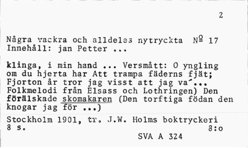 //// 2 //// Ngra vackra och alldeles nytryckta N= 17 Innehll: jan Petter ... //// klinga, i min hand ... Versmtt: 0 yngling om du hjerta har Att trampa fderns fjt; Fjorton r tror jag visst att jag va'... Folkmelodi frn Elsass och Lothringen) Den //// frlskade skomakaren (Den torftiga fdan den knogar jag fr ...) //// Stockholm 1901, tr. J.W. Holms boktryckeri 8 s. 8:o //// SVA A 324 ////