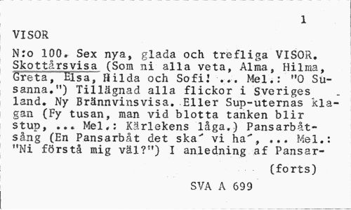//// 1 //// VISOR //// N:o 100. Sex nya, glada och trefliga VISOR. Skottrsvisa (Som ni alla veta, Alma, Hilma, Greta, Elsa, anda och Sofi! Mel.: "0 Su- //// sanna.") Tillgnad alla flickor i Sveriges land. Ny Brnnvinsvisa. Eller Sup-uternas klaj gan (Fy tusan, man vid blotta tanken blir stup, ... Mel.: Krlekens lga.) Pansarbt-sng (En Pansarbt det ska' vi ha', ... Mel.: "Ni frst mig vl?") I anledning af Pansar- //// (forts) //// SVA A 699 ////